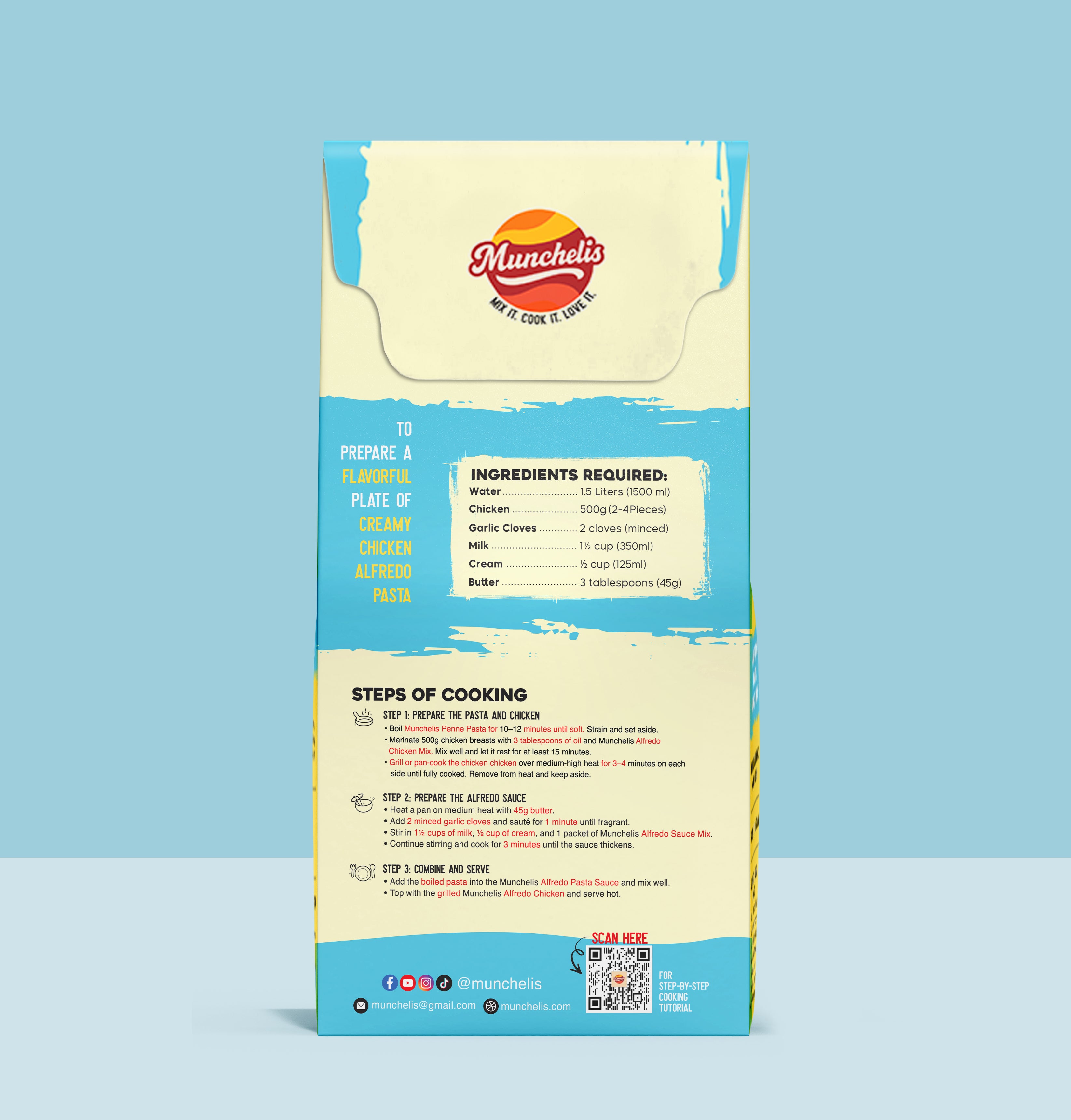 Munchelis Alfredo Pasta lets you easily cook delicious and creamy Alfredo Pasta at home. The kit includes Alfredo Chicken Seasoning, Alfredo Sauce Mix and Penne Pasta—everything you need in one box. Just follow a few simple steps and enjoy a creamy, restaurant-style Alfredo Pasta at home.