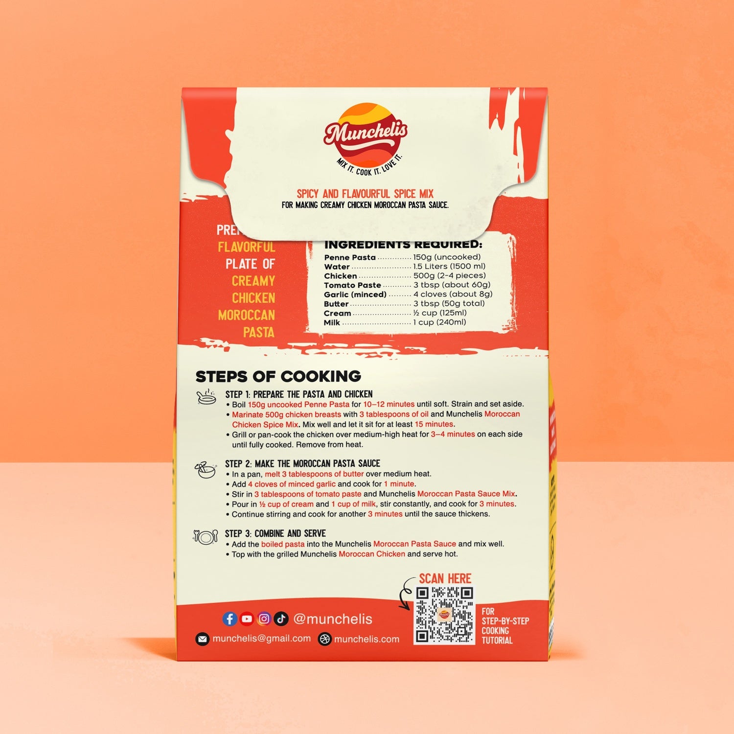 Munchelis Moroccan Pasta lets you easily cook delicious and creamy Moroccan Pasta at home. The kit includes Moroccan Chicken Seasoning, Moroccan Sauce Mix—everything you need in one box. Just follow a few simple steps and enjoy a creamy, restaurant-style Moroccan Pasta at home.